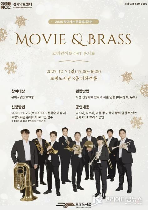 코리아타임뉴스 경기취재본부 | 구리시 토평도서관은 OST 콘서트 'Movie & Brass'의 무료 관람 사전 신청을 11월 26일 오전 9시부터 구리시립도서관 홈페이지를 통해 선착순으로 신청받는다고 밝혔다. 관람 정원은 유아부터 성인까지 총 120명이다.