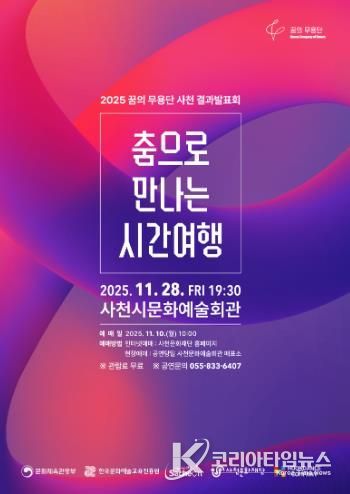 코리아타임뉴스 오영주 기자 | 사천문화재단은 오는 11월 28일 오후 7시 30분, 사천시문화예술회관 대공연장에서 ‘2025 꿈의 무용단 사천’ 결과발표회 '춤으로 만나는 시간여행'을 개최한다.