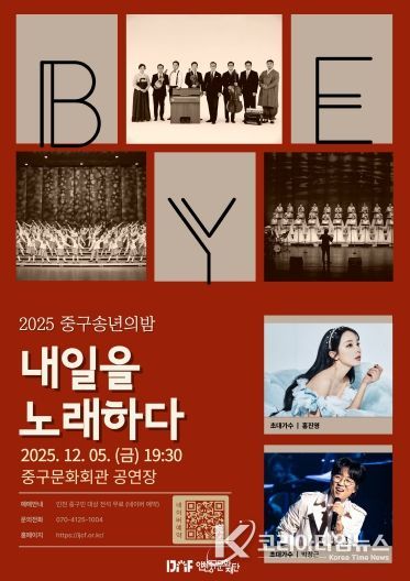 코리아타임뉴스 오영주 기자 | (재)인천중구문화재단(이사장 김정헌)은 연말을 맞이해 중구 구민을 위한 특별한 기획 공연 ‘2025 중구 송년의 밤, 내일을 노래하다’를 오는 5일 저녁 7시 30분 중구문화회관 공연장에서 개최한다.