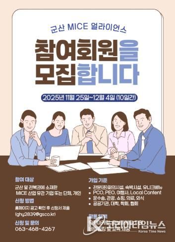 코리아타임뉴스 김태훈 기자 | 군산새만금컨벤션센터(GSCO)는 지역 MICE 산업 활성화 및 국제회의 유치 경쟁력 강화를 위해 '2025 군산 MICE 얼라이언스'신규 회원사를 모집한다.