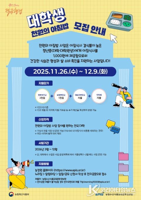 코리아타임뉴스 윤경수 기자 | 농림축산식품부는 전국 대학교와 산업단지 입주기업 또는 협의체 등 조직을 대상으로 2026년도 천원의 아침밥 사업 참여 신청을 11월 26일부터 12월 9일까지 접수한다.
