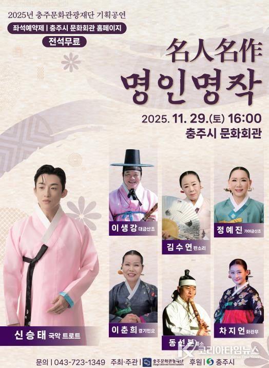 재단 관계자는 “이번 공연은 한국 전통예술을 대표하는 명인들의 작품을 원형 그대로 체험할 수 있는 귀한 무대”라며 “국악의 진한 깊이와 거장들의 예술적 품격을 충주시민들이 가까이에서 느낄 수 있는 기회가 될 것”이라고 밝혔다.