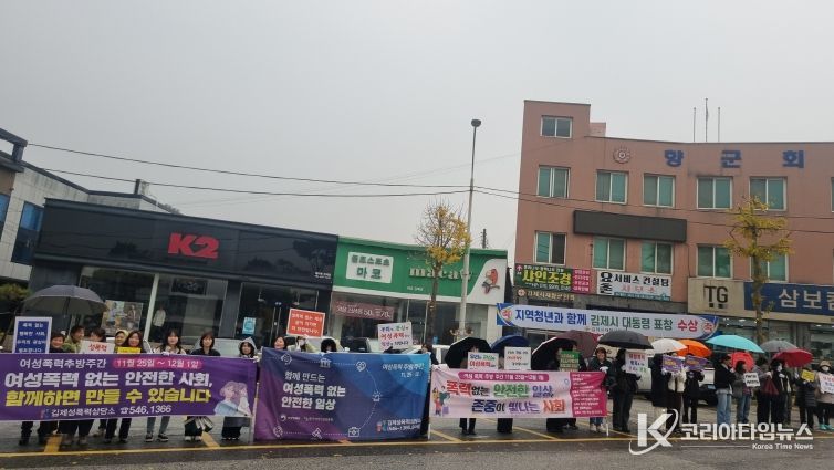 코리아타임뉴스 전북취재본부 | 김제시는 25일 김제터미널 사거리에서 여성폭력 없는 사회를 위해 여성폭력 방지의 의미를 되새기며‘폭력 ZERO 사회’조성을 위한 범시민 대상 폭력예방 캠페인을 실시했다고 밝혔다.