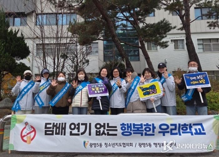 코리아타임뉴스 경기취재본부 | 광명시 광명5동 청소년지도협의회는 지난 25일 광남중학교에서 청소년지도협의회 위원과 광명5동 주민센터 직원 등 13명이 참석한 가운데 청소년 금연캠페인을 열었다.