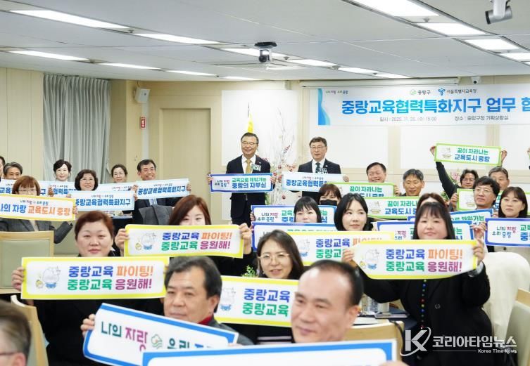 코리아타임뉴스 오영주 기자 | 중랑구는 11월 26일 구청 4층 기획상황실에서 서울특별시교육청과 ‘중랑교육협력특화지구’업무협약을 체결했다. 이번 협약은 2019년 혁신교육지구, 2023년 미래교육지구 추진에 이어 지역 교육 협력사업을 확장하는 단계로, 구·교육청·학교 간 협력 구조를 체계화해 지역 기반 교육 환경을 강화하기 위해 마련됐다.