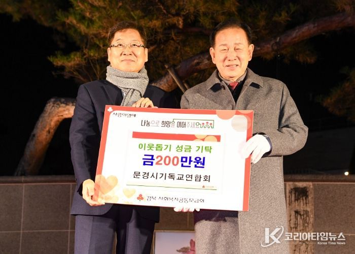 코리아타임뉴스 노승선 기자 | 문경시기독교연합회는 지난 25일 문경시 모전공원 광장에서 열린 ‘2025 시민화합 성탄트리 점등식’을 기념해 지역 내 소외계층을 위한 이웃돕기 성금 200만 원을 문경시에 기탁했다.