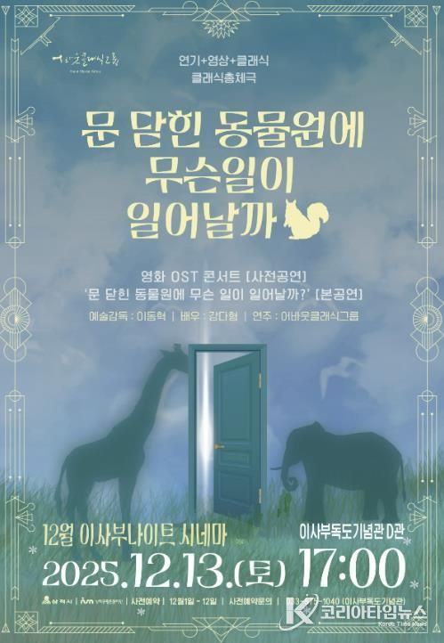 ‘2025 12월 이사부 나이트 시네마’는 12월 13일 17시에 이사부독도기념관에서 개최되며, 어린이와 가족 관람객을 위한 융합형 음악극을 선보일 예정이다. 예술단체 ‘어바웃클래식그룹’의 작품으로, “문 닫힌 동물원에 무슨 일이 일어날까?”라는 주제로 영화 OST 콘서트와 클래식·영상·연극을 결합한 클래식 총체극 형태로 진행된다. 프랑스 낭만주의 작곡가 카미유 생상스의 ‘동물의 사육제’를 원작으로 했으며, 풍부한 상상력과 감성을 자극하는 연출을 통해 한 편의 영화 같은 무대를 제공할 수 있도록 기획됐다.