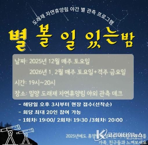 코리아타임뉴스 경남취재본부 | 경남 밀양시는 오는 12월 6일부터 도래재 자연휴양림에서 동절기 야간 별 관측 프로그램 ‘별 볼 일 있는 밤’을 운영한다.