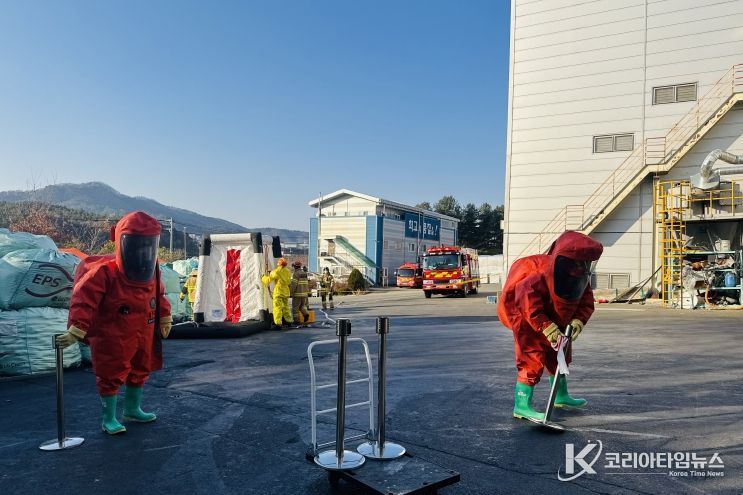 코리아타임뉴스 김태훈 기자 | 영동소방서(서장 이명제)는 용산면에 위치한 ㈜와이엠프로폴에서 유해화학물질 누출사고를 대비한 긴급구조통제단 불시가동 훈련을 실시했다고 27일 밝혔다.