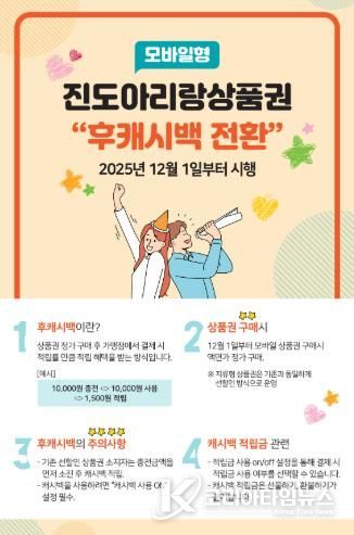 코리아타임뉴스 전남취재본부 | 진도군은 오는 12월 1일부터 카드와 모바일형 진도아리랑상품권의 판매 방식을 ‘후적립(후캐시백)’ 방식으로 전환한다.