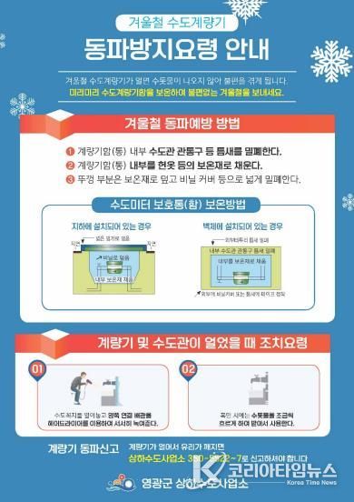 코리아타임뉴스 노승선 기자 | 영광군 상하수도사업소에서는 수도시설 동파로 인한 주민불편 예방을 위해 겨울철 수도시설 동파 방지 대책 계획을 수립하고 수용가를 대상으로 수도계량기함과 옥내 급수관 보온조치 등 겨울철 수도계량기 동파방지를 위해 홍보하고 있다.