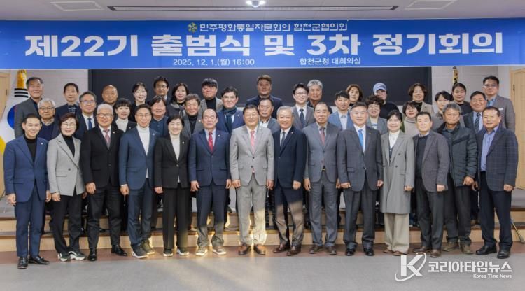 코리아타임뉴스 경남취재본부 | 민주평화통일자문회의 합천군협의회는 12월 1일 오후 4시 합천군청 대회의실에서 합천군수, 자문위원 등 50여명이 참석한 가운데 ‘제22기 출범식 및 2025년 3차 정기회의를 개최했다.