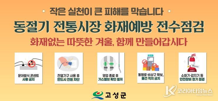코리아타임뉴스 김태훈 기자 | 고성군은 12월 2일 동절기를 맞아 전통시장 내 화재예방 및 안전사고 방지를 위해 소방, 전기, 가스분야에 대한 전수 점검을 실시했다.