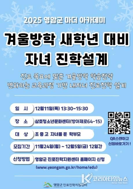 코리아타임뉴스 노승선 기자 | 영암군진로진학지원센터가 11일 삼호청소년문화센터에서 ‘겨울방학 새학년 대비 자녀 진학설계’를 주제로 ‘2025 마더 아카데미’를 개최한다.