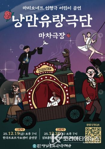 코리아타임뉴스 전남취재본부 | (재)영암문화관광재단은 연말을 맞아 영암군 어린이와 가족을 위한 마리오네트 인형극 어린이 공연 '낭만유랑극단:마차극장'을 오는 12월 19일 오후 7시에 한국트로트가요센터 공연장과 12월 20일(토) 오후 7시에 삼호종합문화체육센터 대회의실에서 개최한다.