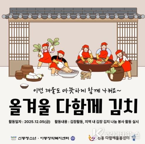 코리아타임뉴스 이아름 기자 | 정선군 신동 다함께돌봄센터와 신동청소년아동장학복지센터가 연계하여 오는 2025년 12월 5일, 아동·청소년과 함께하는‘올겨울 다함께 김치’ 김장체험 및 나눔행사를 진행한다.