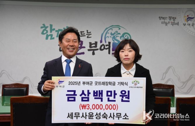 코리아타임뉴스 충남취재본부 | 세무사윤성숙사무소(대표 윤성숙)는 지난 3일 부여군청을 방문하여 인재 육성을 위한 장학금 3백만 원을 (재)부여군굿뜨래장학회에 기탁했다.