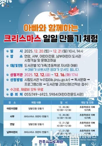 코리아타임뉴스 경남취재본부 | 진주시립도서관은 ‘아빠와 함께하는 2025년 크리스마스 일일 만들기 체험’ 특강 참가자를 모집한다.