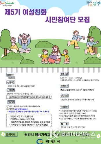 시 관계자는 “여성친화 시민참여단은 시민의 경험과 시각이 정책으로 이어지는 중요한 통로”라며 “광양시는 그동안 시민참여단 운영을 통해 생활밀착형 정책 제안과 현장 중심 모니터링을 지속해 왔다. 일상에서 느낀 불편과 아이디어를 정책에 반영하고자 하는 시민들의 적극적인 참여를 기대한다”고 말했다.