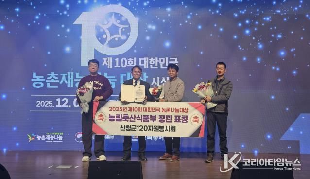 코리아타임뉴스 경남취재본부 | 산청군 120자원봉사회는 지난 9일 세종컨벤션센터에서 열린 ‘제10회 대한민국 농촌재능나눔 대상’ 시상식에서 농림축산식품부 장관 표창을 수상했다고 11일 밝혔다.