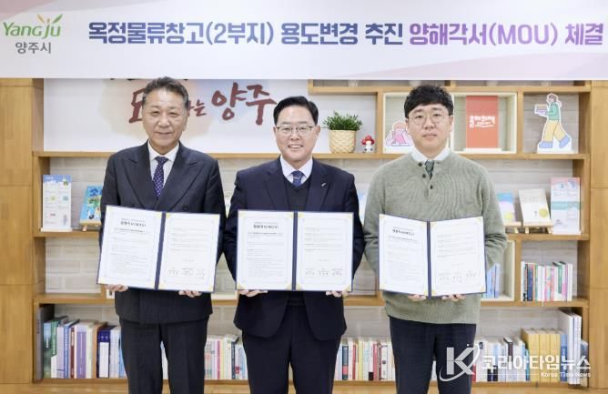 코리아타임뉴스 윤광희 기자 | 양주시가 26일 시청 시장실에서 옥정물류창고 2부지 사업 취소와 용도변경 추진을 위한 양해각서를 체결했다.