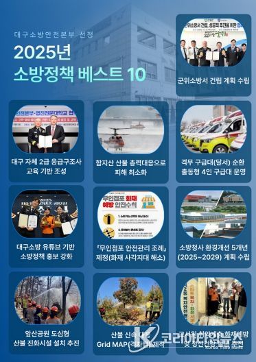 코리아타임뉴스 김태훈 기자 | 대구소방안전본부는 2025년 한 해 동안 추진한 주요 소방정책 가운데 현장 대응력 강화와 시민 안전 증진에 기여한 ‘2025 대구소방 소방정책 베스트 10’을 선정해 발표했다.