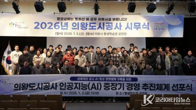 코리아타임뉴스 윤광희 기자 | 의왕도시공사가 1월 2일, 평생학습관 공연장에서 개최된 시무식에서 인공지능(AI) 경영 문화 확산을 위한 ‘인공지능 중장기 경영 추진체계 선포식’을 개최했다.
