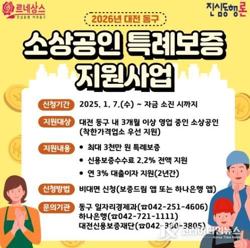 코리아타임뉴스 윤광희 기자 | 대전 동구는 경기 침체와 고금리 기조로 경영에 어려움을 겪고 있는 지역 소상공인을 지원하기 위해 ‘2026년 소상공인 특례보증 지원사업(진심동행론)’을 본격 시행한다고 6일 밝혔다.