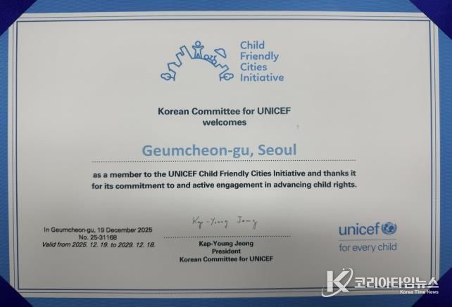 코리아타임뉴스 윤광희 기자 | 금천구는 유니세프 한국위원회로부터 아동친화도시 재인증을 획득했다고 7일 밝혔다.