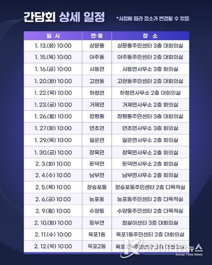 코리아타임뉴스 경남취재본부 | 거제시는 오는 13일 상문동을 시작으로 한 달간 2026년 면‧동 순방(시민공감 간담회)을 실시한다.