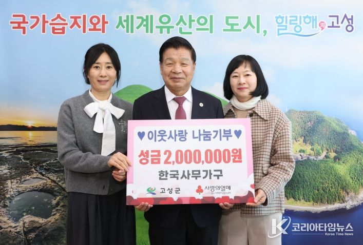 코리아타임뉴스 경남취재본부 | 고성군 대독리 소재 한국사무가구 김현주 부사장은 1월 6일, 고성군청을 방문하여 관내 어려운 이웃을 위해 써 달라며 이웃돕기성금 200만 원을 전달했다.
