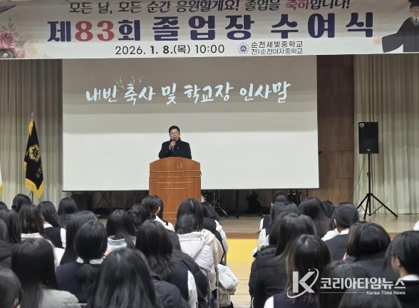 코리아타임뉴스 노승선 기자 | 김정희 전남도의회 교육위원장은 1월 8일, 순천세빛중학교에서 열린 제83회 졸업식에 참석해 졸업생들의 새로운 출발을 축하하고, 전남교육의 미래를 향한 따뜻한 격려의 메시지를 전했다.