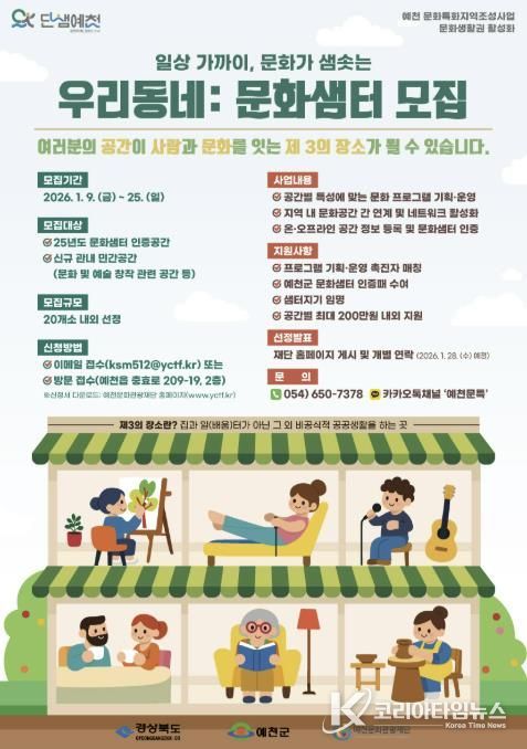 코리아타임뉴스 경북취재본부 | 예천군과 (재)예천문화관광재단은 ‘문화특화지역 조성사업’의 일환으로 문화생활권 조성을 위한 ‘우리동네:문화샘터’ 2기 참여자를 9일부터 25일까지 모집한다.