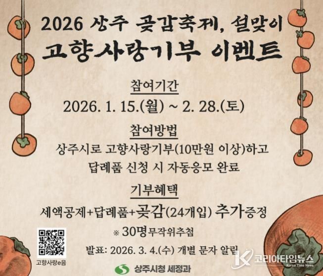 코리아타임뉴스 노승선 기자 | 상주시는 2026 상주곶감축제 및 설 명절을 맞이하여 1월 15일부터 2월 말까지 고향사랑기부 이벤트를 실시한다.