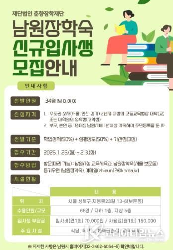 코리아타임뉴스 김태훈 기자 | 재단법인 춘향장학재단에서 운영하는 남원장학숙이 2026년도 신규입사생을 모집한다.