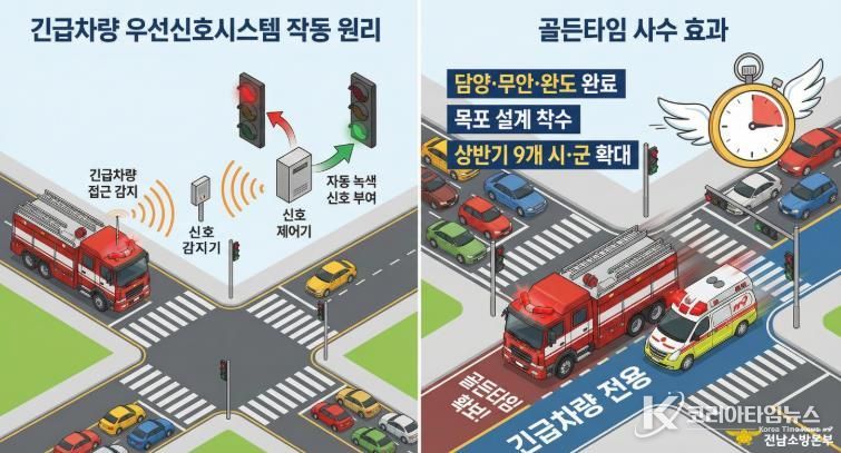 코리아타임뉴스 김태훈 기자 | 전남소방본부는 화재·구급 등 위급 상황 발생 시 소방차와 구급차의 신속한 현장 도착을 돕기 위해 ‘긴급차량 우선신호시스템’을 확대 운영한다고 밝혔다.