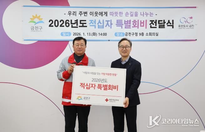 코리아타임뉴스 윤광희 기자 | 금천구가 지난 13일 대한적십자사 서울지사에 2026년도 적십자 특별회비를 전달하며 나눔에 동참했다고 밝혔다.