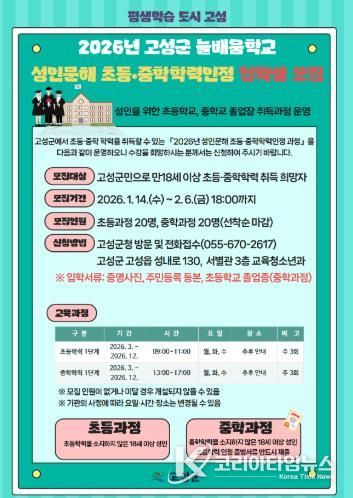 코리아타임뉴스 경남취재본부 | 고성군은 학력 취득을 희망하는 성인 학습자를 위한 학력인정 문해교육 프로그램인 ‘고성군 늘배움학교’의 2026학년도 입학생을 모집한다.