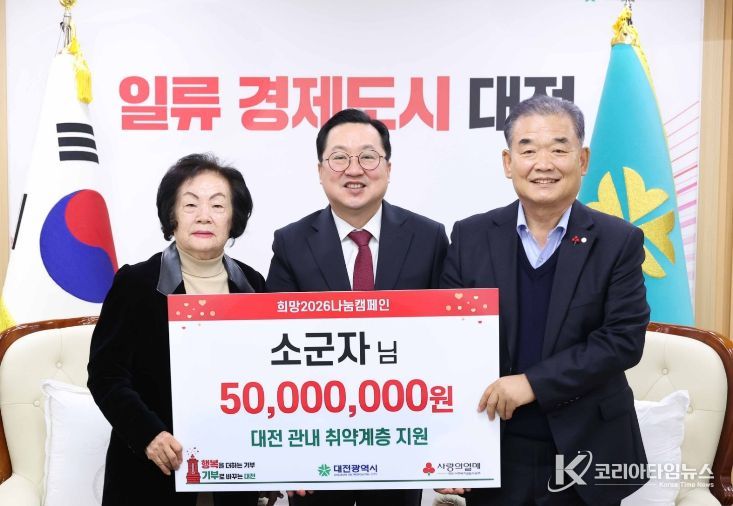 코리아타임뉴스 대전취재본부 | 대전시는 15일 오전 시청 10층 응접실에서 아너소사이어티 회원인 소군자 기부자(124호)로부터 대전사회복지공동모금회를 통해 관내 취약계층 지원을 위한 성금 5천만 원을 전달받았다.