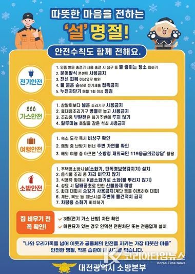 코리아타임뉴스 김태훈 기자 | 대전소방본부는 2월 설 명절을 앞두고 1월 19일부터 2월 15일까지‘설 명절 대비 화재예방대책’을 추진한다.