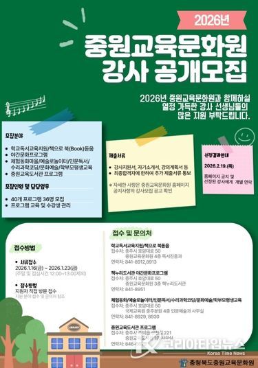 코리아타임뉴스 사회팀 | 충청북도교육청 직속기관 중원교육문화원은 23일까지 학생과 학부모, 지역주민을 대상으로 운영하는 2026년도 인문독서 및 문화예술 프로그램 강사를 공개 모집한다고 밝혔다.