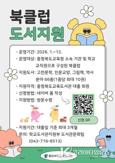코리아타임뉴스 사회팀 | 충청북도교육청 직속기관 교육도서관은 1월부터 12월까지 도내 교직원의 지속적인 독서 활동을 장려하고 책 읽는 문화를 확산하기 위해 2026년 '공감하는 북클럽 도서 지원 사업'을 연중 상시 운영한다.