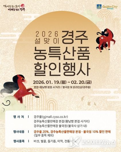 코리아타임뉴스 노승선 기자 | 경주시는 2026년 병오년 설을 맞아 1월 19일부터 2월 20일까지 ‘경주농특산물판매장 설맞이 특별할인 행사’를 진행한다고 18일 밝혔다.