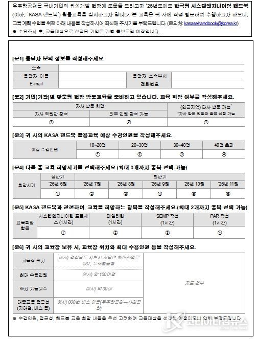 이번 활용 교육은 현장의 요청과 함께 우주청 개청 이후 지속해 온 '민간 역량 강화를 통한 위성산업 자립화'를 위한 기업 지원의 일환으로 기획되어 기업을 직접 방문하여 현장 맞춤형으로 실시한다. 교육대상 선정을 위한 수요조사는 1월 19일부터 31일까지 실시하여 기업에 소속된 핸드북 신청자에게 수요조사서를 송부하고 핸드북 전담 이메일로 접수를 받는다.