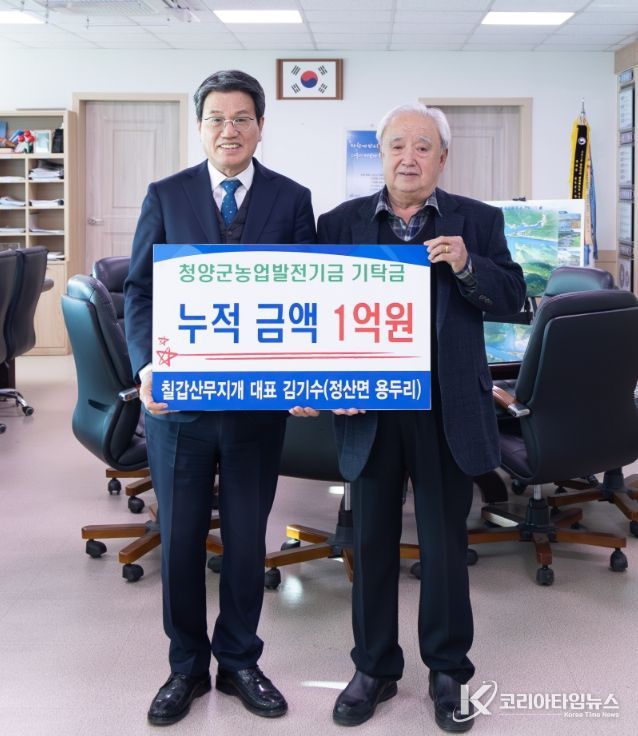 코리아타임뉴스 김택호 기자 | 청양군은 정산면 용두리 소재 ‘칠갑산무지개’의 김기수 대표가 군청을 방문해 농업발전기금 1,000만 원을 기탁하면서 올해로 마침내 누적 기탁금 1억 원을 달성했다고 밝혔다.