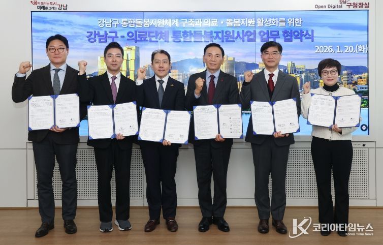 코리아타임뉴스 의료보건팀 | 꿈이 모이는 도시, 미래를 그리는 강남구가 1월 20일 관내 5대 의료단체(강남구 의사회·치과의사회·한의사회·약사회·간호사회)와 ‘강남구 통합돌봄지원체계 구축을 위한 의료·요양 통합돌봄지원사업 업무협약(MOU)’을 체결했다.