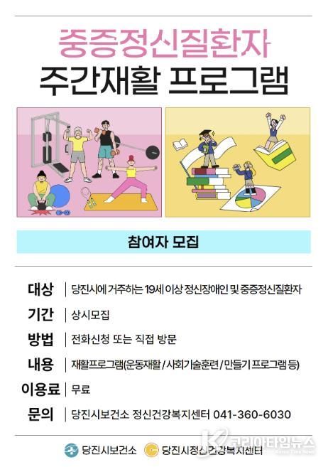 코리아타임뉴스 김택호 기자 | 당진시는 정신건강복지센터에서 중증 정신질환자 주간재활 프로그램 신규 참여자를 연중 모집한다고 21일 밝혔다.