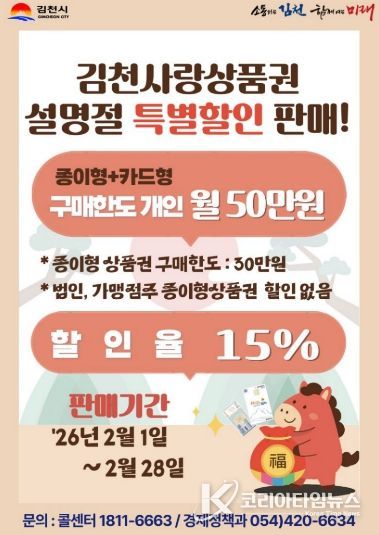 코리아타임뉴스 경북취재본부 | 김천시는 오는 설 명절을 앞두고 2월 한달간 김천사랑상품권을 15% 특별 할인 판매하여 지역 소비 활성화에 나선다.