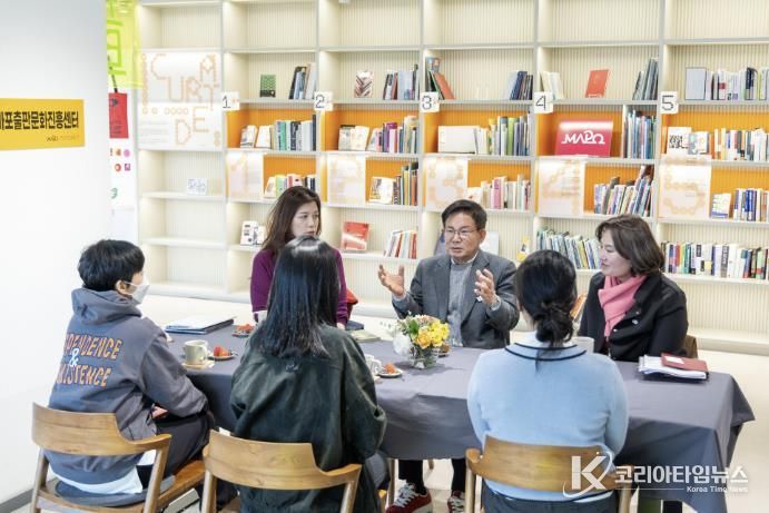 차담회에는 박강수 마포구청장과 민지형 작가, 차영지 대표, 홍경화 대표, 최진영 센터장 등이 참석했다.