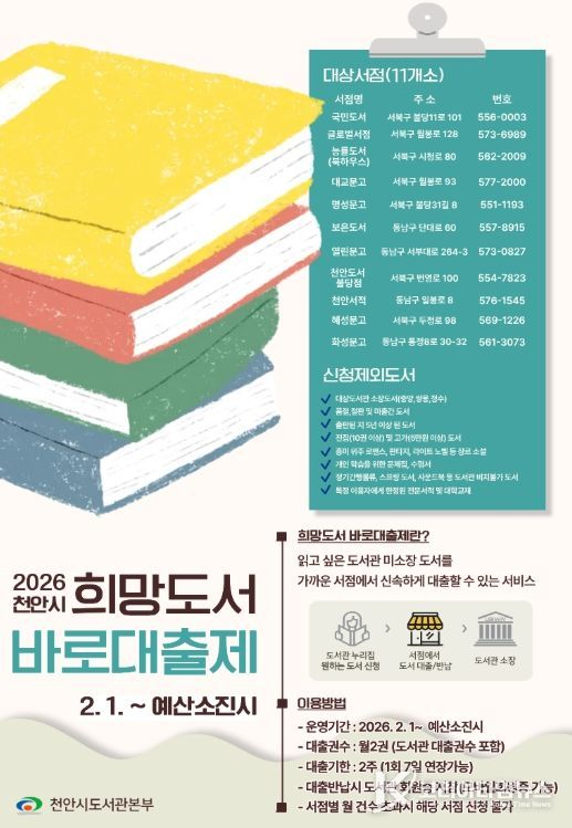 코리아타임뉴스 김택호 기자 | 천안시도서관본부는 내달부터 ‘희망도서 바로대출제’ 서비스를 운영한다고 30일 밝혔다.